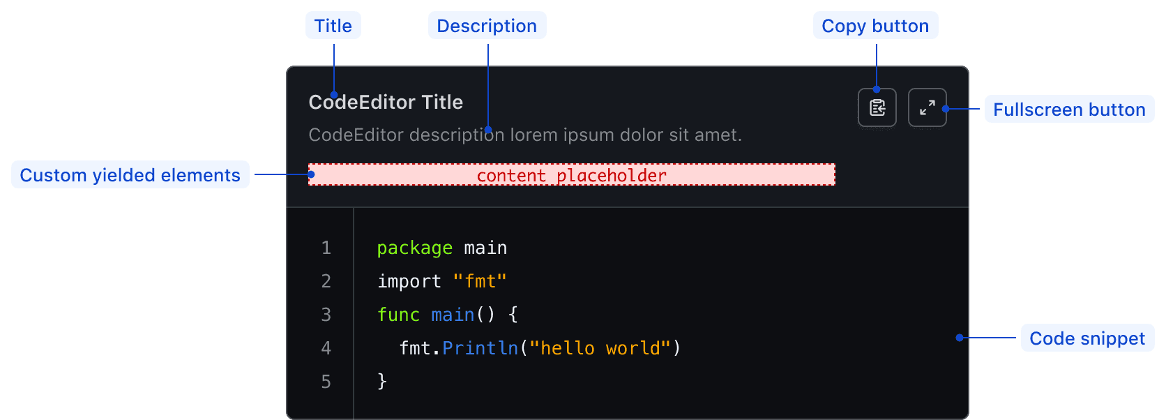 Optionally, you can pass a title and/or a description using the [CE].Title and [CE].Description components yielded by the Code Editor component.